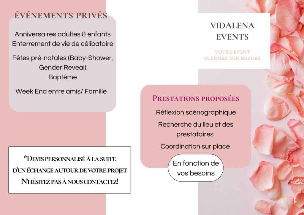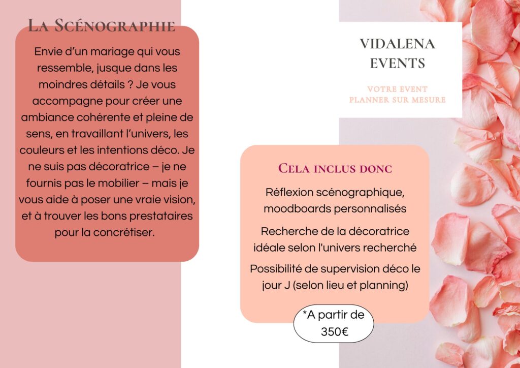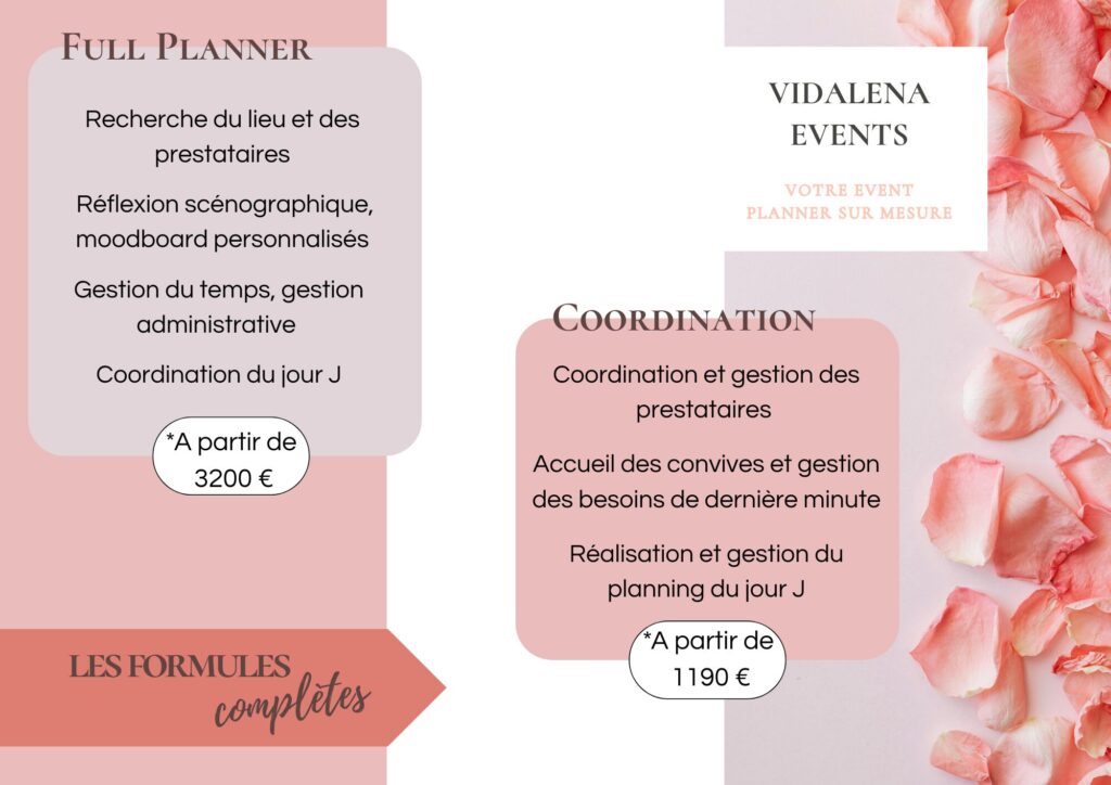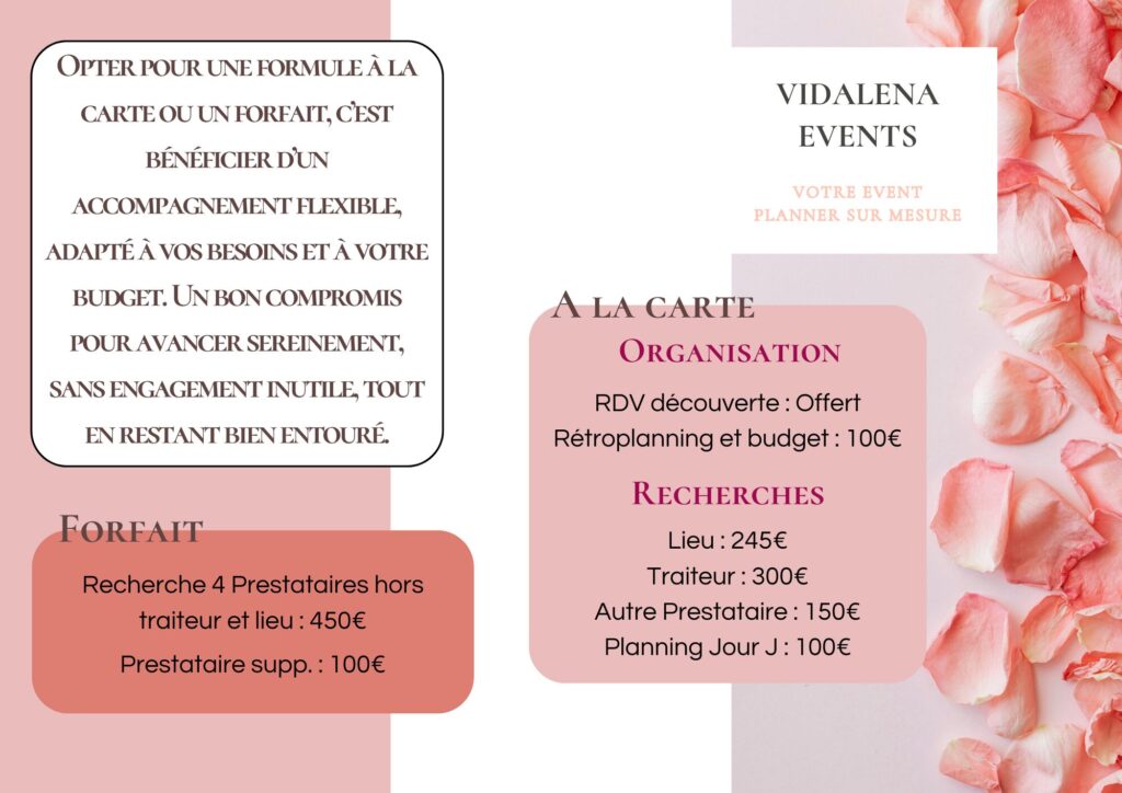 Chaque projet est unique. Les tarifs présentés sont donné à titre indicatif et sont ajustés selon votre projet, vos envies, et le niveau d’accompagnement souhaité. N’hésitez pas à me contacter directement pour un devis personnalisé.